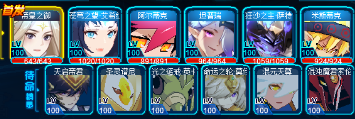 分别是:天尊,暴乱格劳瑞,大象,圣甲盖亚。替补精灵配置参考